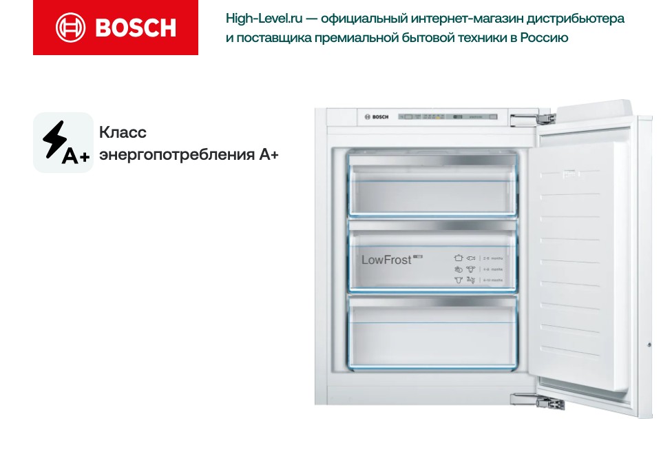 Внутреннее пространство спроектировано с упором на рациональность: общий объем 72 л полностью отведен под морозильную камеру с тремя вместительными ящиками, позволяющими удобно сортировать продукты по типу и срокам хранения. Бош GIV11AFE0 оснащен аксессуарами для повседневного удобства: форма для льда и аккумулятор холода входят в комплект, а встроенный календарь хранения помогает контролировать срок годности продуктов.