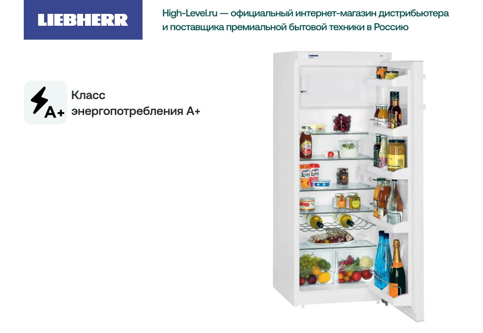 Холодильник Liebherr K 2734 выполнен в стиле современный, цвет фронтальной поверхности — белый. Этот отдельностоящий прибор станет оптимальным решением для качественного хранения продуктов. Высота модели составляет 142 см, ширина — 55 см, глубина — 62.9 см. Высокий класс энергоэффективности A+ гарантирует экономичное потребление электроэнергии.