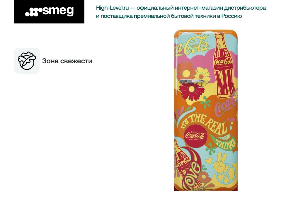 Тип петель (шарнира): стандартный, Глянцевая отделка, Дизайн: скругленный выпуклый, Материал дверцы: термоформируемый полимер, Цвет боковин: красный, Цвет профиля на полках и ящиках: хромированный, Коллаборация: Smeg&Coca-Cola, Класс эмиссии воздушного ак