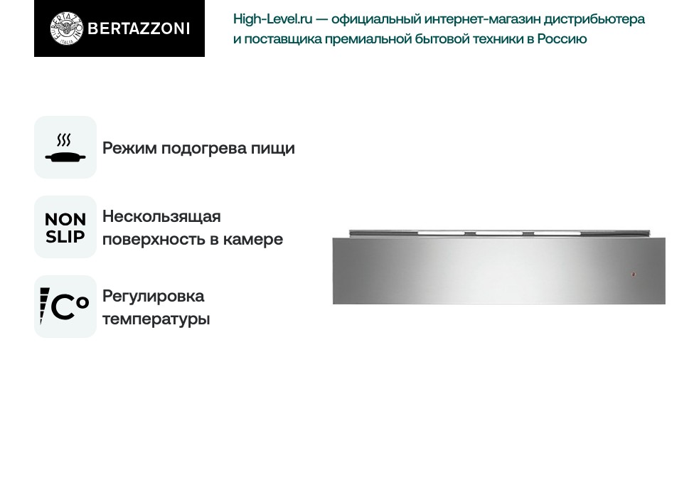 Ящик для подогрева посуды Bertazzoni WD60X Этот встраиваемый ящик для подогрева посуды выполнен в профессиональном дизайне серии Professional и отделан нержавеющей сталью, что подчеркивает строгую кухонную эстетику и обеспечивает повышенную износостойкость корпуса. T-образная конструкция позволяет аккуратно интегрировать прибор в мебельный модуль глубиной 26 см и шириной встраивания 77 см, сохраняя при этом минимальную высоту встраивания 60 см и вместительность, соответствующую стандартным кухонным нишам (размер ниши 140×560×540 мм). Фронтальная панель с полностью выдвигающимся ящиком оснащена механизмом Push-to-Open — удобным решением для плавного открытия без использования дополнительных ручек, а внутренняя поверхность покрыта резиновым слоем для защиты приборов и посуды во время эксплуатации. Функционально устройство рассчитано на нагрев и поддержание температуры в диапазоне 30-85 °C, что делает его пригодным для разогрева и подогрева блюд, тарелок и посуды сразу перед подачей. Нагрев регулируется механически с помощью кнопочных органов управления Soft Touch, расположеных спереди; предусмотрена регулировка температуры и индикатор работы термостата, а также лампочка включения-выключения. Есть опция остаточного хода и режим работы 24 часа с интервальной работой, что удобно при длительном поддержании тепла. Полностью выдвигаемый ящик выдерживает нагрузку до 25 кг и оснащен нескользящим ковриком для безопасного размещения посуды. Прибор комплектуется жироулавливающим алюминиевым фильтром, пригодным для мытья в посудомоечной машине, и позволяет устанавливать угольный фильтр типа KIT 0278 (покупается отдельно, требуется 2 штуки) для режимов рециркуляции и очистки воздуха. Наличие функции Clean Air и периметрической системы всасывания усиливает циркуляцию и помогает сохранять внутреннее пространство чистым от запахов. Электрические параметры — напряжение 220-240 В, мощность подключения 400 Вт, сила тока 10 А, мощность мотора 145 Вт и длина кабеля 1,5 м — обеспечивают стабильную работу при стандартных условиях. Технические характеристики также включают компактные внешние размеры 12.5×59.5×56 см (ВхШхГ), вес 10,5 кг (в упаковке 12 кг), диаметр воздуховода 150 мм и совместимость с системой выведения воздуха. Освещение рабочего пространства реализовано двумя светодиодными лампами по 1.6 Вт с функцией Dimm и регулировкой яркости, что облегчает контроль содержимого ящика. Дополнительные преимущества — брызгозащитный корпус, мягкость управления и наличие всех необходимых аксессуаров в комплектации (вытяжка, жироулавливающий фильтр, вилка питания, документация). Гарантия 12 месяцев, производство Италия. Ключевые преимущества