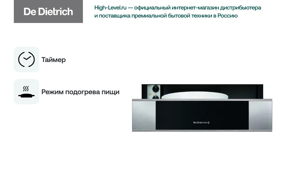 Подогреватель посуды DWD1514X — вместительная и функциональная модель от Di Dietrich. Еда и напитки в подогретой посуде дольше сохраняет тепло, а соусы и запеканки не теряют внешний вид и необходимую консистенцию. Система Push Pull обеспечивает легкое открытие и закрытие без усилий, а направляющие Quadro — легкое выдвижение. Специальный коврик предотвращает скольжение посуды для комфортной загрузки и выгрузки предметов.