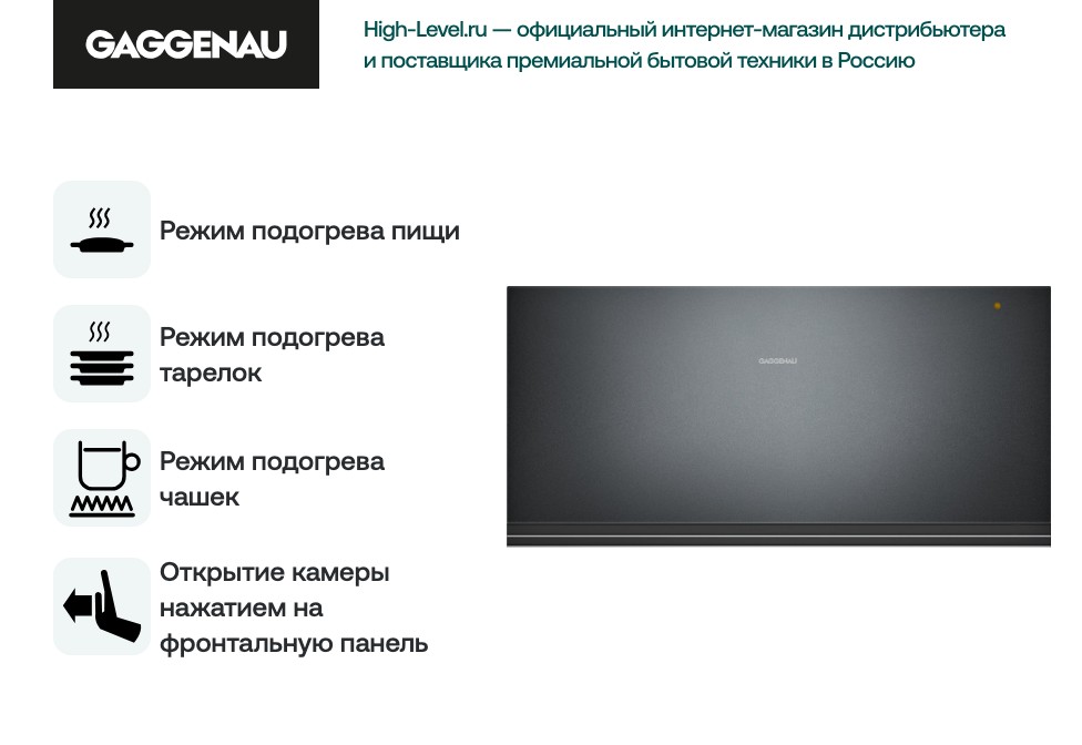 Модель Gaggenau WSP 222-100 предназначена для подогрева посуды (необходимо при подаче сложных блюд или подготовке торжества), а также обработки продуктов. Один из основных вариантов использования — прогрев тарелок, который предотвращает изменения вкуса или текстуры ресторанных порций. Также с помощью этого прибора можно поднять температуру на поверхности чашек, чтобы свежесваренный кофе полностью сохранил свои качества. Общее количество режимов работы — 4 шт. Вы можете самостоятельно регулировать температуру в зависимости от своей цели.