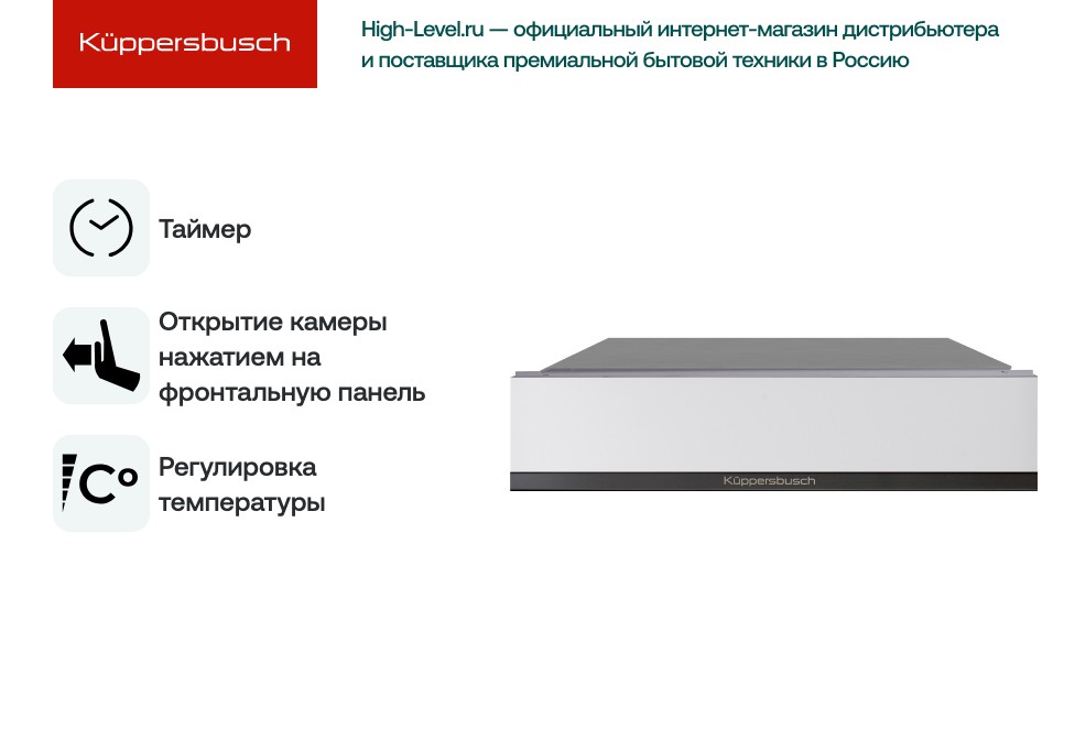Эстетичный корпус из нержавеющей стали с фронтом из белого стекла и акцентами черного хрома формирует строгий профессиональный образ и легко интегрируется в современную кухонную мебель. Конструкция Т-образного типа рассчитана на встраивание в шкаф высотой 60 см и подходит для ниш размером 595×560×550 мм, при этом ширина установки — 77 см, что делает прибор идеальным решением для компактных кухонь и проектов с продуманной эргономикой. Стеклянный фасад можно снять и заменить мебельной панелью по желанию, а выдвижная фронтальная панель с механизмом Push-to-Open обеспечивает удобство доступа к отделению и безопасность открывания. Внутренняя поверхность имеет резиновое покрытие и нескользящий коврик, позволяющие аккуратно размещать приборы и комплекты посуды без риска смещения; полность выдвигаемый ящик выдерживает нагрузку до 20 кг и рассчитан на набор столовых приборов на 6 персон или до 20 тарелок диаметром 28 см.