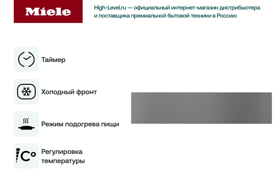 Миле ESW 7010 GR/GR сочетает продуманные функции и лаконичный дизайн, делая акцент на практичности: мягкое открывание выдвижного ящика, ровный тепловой режим и возможность использования в разных сценариях — от подогрева готовых блюд до сушки посуды и предварительного разогрева тарелок. Такое устройство легко вписывается в рабочие зоны: оно не только поддерживает температуру сервируемых блюд, но и выступает как аккуратный декоративный элемент, не перегружая пространство лишними деталями. Простота обслуживания и долговечность отделки обеспечивают долгую службу без потери внешнего вида, а универсальный дизайн позволяет сочетать прибор с разнообразными отделочными материалами и цветами кухни.