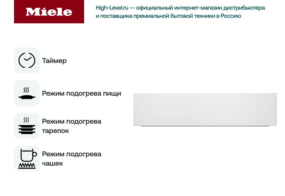 Стиль и комфорт Модель Miele ESW6214 BRWS бриллиантовый белый предназначена для подогрева посуды (необходимо при подаче сложных блюд или подготовке торжества), а также обработки продуктов. Один из основных вариантов использования — прогрев тарелок, который предотвращает изменения вкуса или текстуры ресторанных порций. Также с помощью этого прибора можно поднять температуру на поверхности чашек, чтобы свежесваренный кофе полностью сохранил свои качества. Обратите внимание на функцию поддержания тепла: она пригодится, если вы готовите несколько блюд, которым требуется разное время. Чтобы ни одно из них не остыло, дожидаясь завершения всего процесса, поместите его в эту камеру. Общее количество режимов работы — 4 шт. Вы можете самостоятельно регулировать температуру в зависимости от своей цели. Если вам нужно подогреть блюдо из холодильника, то воспользуйтесь отдельной функцией. Благодаря этому можно не запускать микроволновку или духовку. Используйте прибор как дополнение к духовому шкафу — готовьте при низкой температуре разные гарниры, мясо или рыбу, сохраняя их сочную текстуру. Вы можете установить таймер для комфортной работы. Ящик выдвигается полностью, что дает максимальный доступ к камере, облегчает загрузку и выгрузку посуды. Дверца открывается нажатием на специальную область фронтальной панели — таким образом модель Миле отлично вписывается даже в современный бесшовный дизайн интерьера.