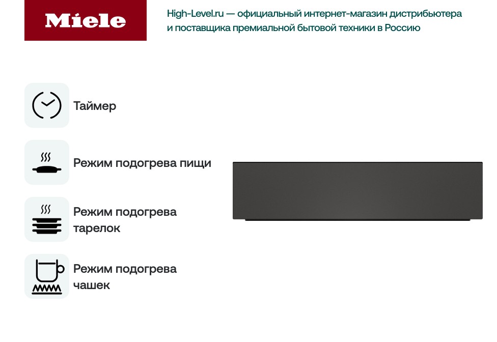 Стиль и комфорт Функциональный подогреватель Гурмэ от Miele в графитовом сером цвете станет оптимальным дополнением на кухне. Изящная стеклянная панель с сенсорными кнопками обеспечит комфортное управление, символьные надписи проинформируют о текущем режиме. В модели установлен механизм Push-to-open — открытие и закрытие прибора нажатием. Дизайн ArtLine позволит вписать прибор в интерьер кухни без ручек. Полностью выдвигаемый ящик Возможность объединения в сеть с кофемашиной Коврик с нескользящей поверхностью
