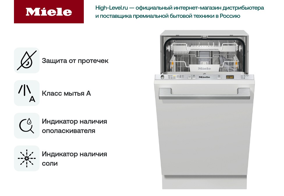 Машина оснащена функцией защиты от протечек и блокировкой кнопки включения для безопасности использования. Она также имеет индикаторы наличия ополаскивателя и соли, а также хода программы. Третий уровень загрузки и поддон для столовых приборов делают процесс загрузки и разгрузки посуды более удобным и эффективным.