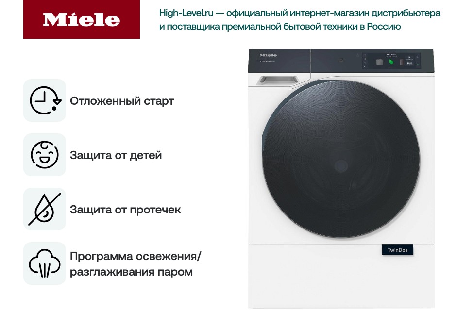 Miele WQ 1000 WPS Nova Edition представляет собой комплексное решение для организации домашней стирки с акцентом на удобство, автоматизацию и сохранность вещей. Аппарат сочетает понятный интерфейс, дополнительные сервисы вроде автоматического дозирования и паровой обработки, а также опции для гибкой настройки режимов. Это практичная и технологичная прачечная техника для пользователей, которые ценят экономию времени, минимизацию ручной работы и стабильную защиту при эксплуатации.