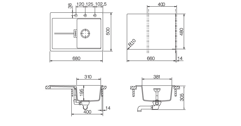 Схема для мойки Schock Horizont 40D Small Cristadur (монтаж в уровень со столешницей) магнолия
