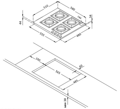 Схема встраивания для варочной панели Korting HG 665 CTRN