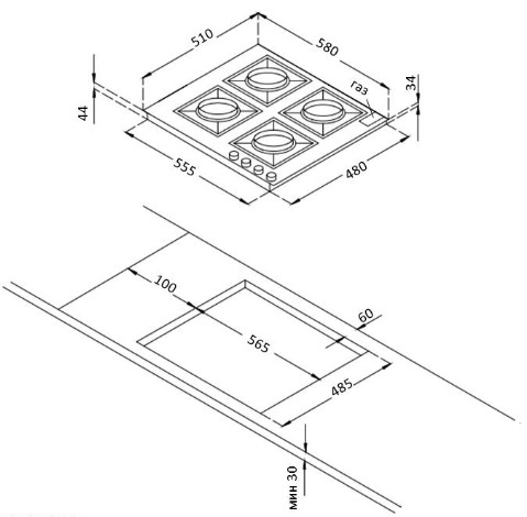 Схема встраивания для варочной панели Korting HG 660 CRB